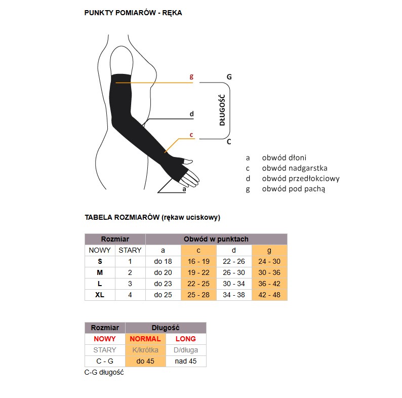 Měření by se mělo provádět nejlépe ráno, protože končetiny během dne otékají a naměřené hodnoty by nebyly správné. Změřte obvody ve všech bodech podle velikostní tabulky výrobku (jejich umístění na končetině je znázorněno na fotografiích). Při určování velikosti jsou klíčové hodnoty v bodě c (obvod zápěstí) a g (obvod podpaží). Neméně důležité je měření délky rukávu mezi body c – g.